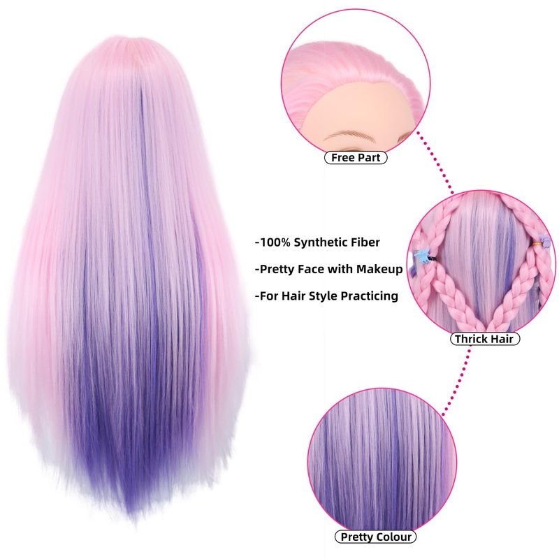 Mannequin Head with Hair, Eumos 29'' Doll Head for Hair Styling Training Head Manikin Practice Cosmetology Doll Head Styling Hairdressing Training Braiding Heads with Clamp Holder (Pink Purple)