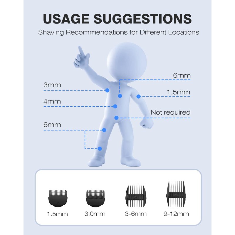 - Long-Lasting and Rechargeable: Welcome to the Environmental Enthusiasts Club! Save time and money with the MANSPOT body trimmer. With up to 20 uses on a single charge, it's a durable and reliable choice for all your grooming needs. Featuring electric trimmer guards with four lengths (1.5mm, 3mm, 3-6mm, 9-12mm), it suits any trimming preference. The 1.5mm guard is ideal for those who prefer a very close trim or shave.