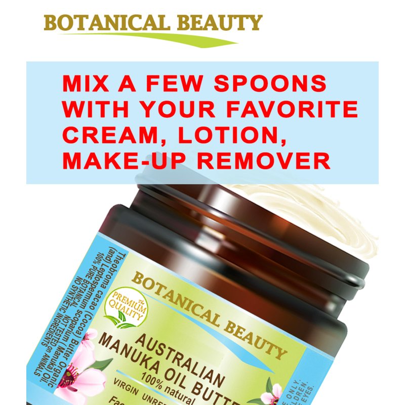 Botanical Beauty Australian MANUKA OIL BUTTER RAW is characterized as a butter with healthful effects that we can call “The DIVINE HEALING NECTAR ” with Cocoa Butter and Manuka Honey essential Oil
