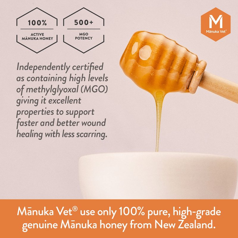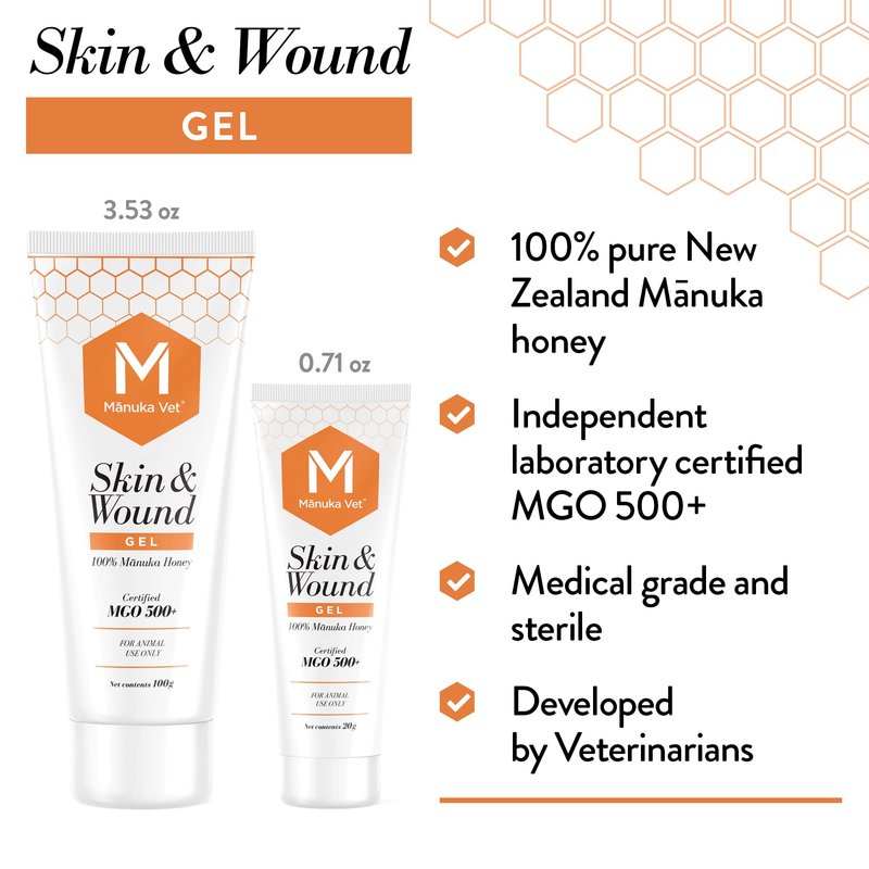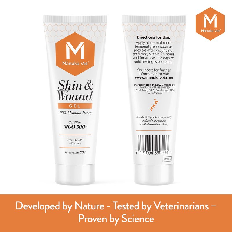 Manuka Vet Skin & Wound Gel is a topical ointment for use on animals with minor wounds and skin abrasions including burns, cuts, scratches, bites and hot spots. It contains 100% pure medical-grade Manuka honey from New Zealand. The gel creates a protective barrier against dirt, debris and other contaminants while moisturizing the wound and creating an ideal wound healing environment. The medical-grade Mānuka honey (UMF 15+) in Manuka Vet Skin & Wound Gel heals wounds faster with less inflammation and scarring. Developed by Nature - Tested by Veterinarians - Proven by Science. Traceable to the original beekeeper in New Zealand.