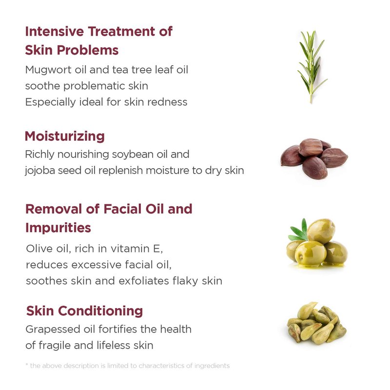 - [RIGHT INGREDIENTS FOR YOUR SKIN]: Mugwort and Tea Tree Leaf Oil— Calms problematic skin and is generally safe for all skin types. Glycine Soja (Soybean) Oil and Jojoba Seed Oil—Moisturizes the skin. Olive Oil— Removes excess oil of the skin, soothes skin, and exfoliates flaky skin. Grape Seed Oil— Promotes moisture retention of the skin.