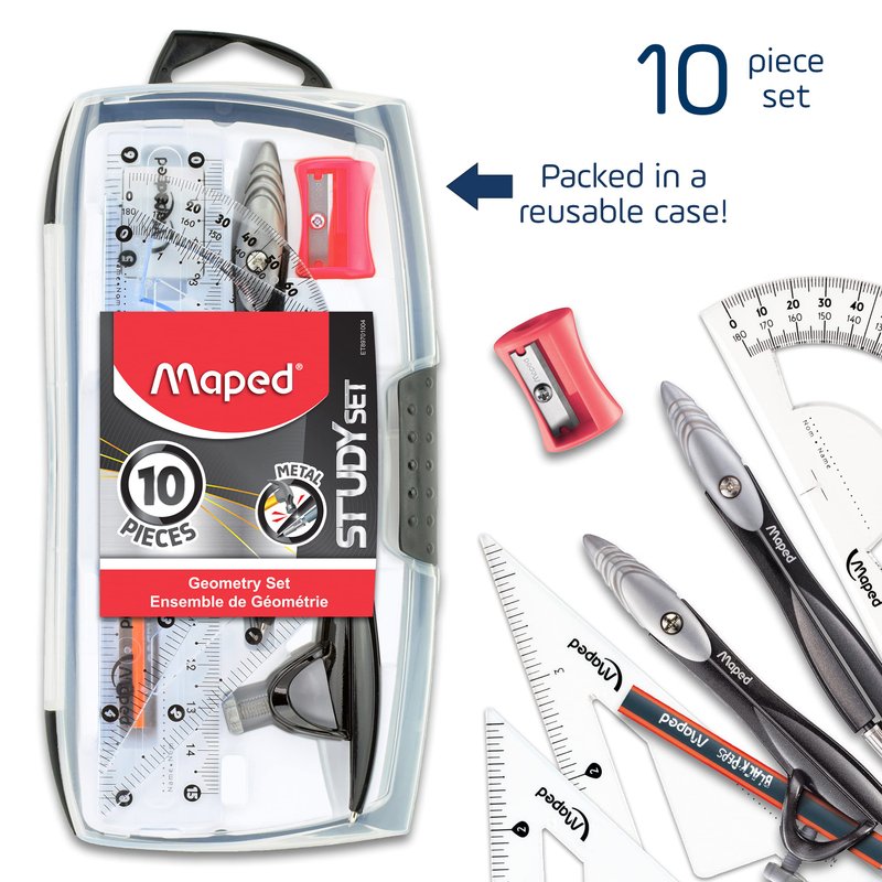Maped Study Geometry 10 Piece Set, Includes 2 Metal Study Compasses, 2 Triangles, 6 Ruler, 4 Protractor, Pencil for Compass, Pencil Sharpener, Eraser, Lead Refill (897010)
