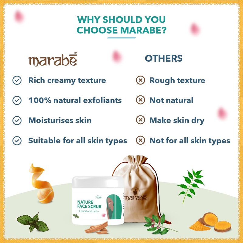 Revitalize your skin with Marabe Nature Face Scrub, featuring a unique blend of 16 traditional herbs. This exfoliating scrub gently removes dead skin cells, unclogs pores, and promotes a smoother, more radiant complexion. Infused with natural ingredients, it helps improve skin texture while providing a refreshing and invigorating experience. Ideal for all skin types, it nourishes and rejuvenates your skin, leaving it feeling soft and revitalized. Incorporate this scrub into your skincare routine for a natural boost of freshness and clarity.