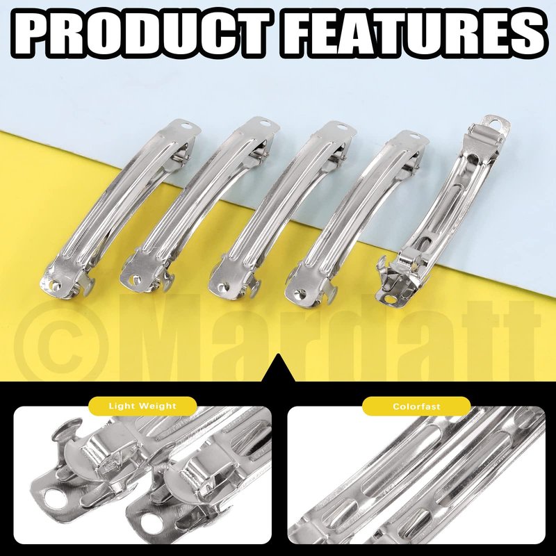Mardatt 80 Pcs French Barrette Hair Clips Assortment Set 2.75 Inch Silver Metal Blank Alligator Hairpin Rectangle Craft Bow Clips for DIY Hairdressing Accessories (7 cm)♥ ♥Product Specification: Color: Silver Material: Metal Style:French Quantity: 100pcs ♥ ♥Why Shall You Choose “Mardatt”?♥ ♥ ☺Multi Uses: Ideal for clothes decors, bag ornaments, hair decoration, DIY hair bow,etc. ☺For Wedding Jewelry Makings: you could attach the pearl cabochon to the hairpin for your handmade jewelry to your bridal or bridesmaids in the weeding. ☺ As Sweet Gift: You can design special hair accessories as gifts for your mother, wife, daughter, girl friend, etc. Best gift for Mother's Day, Valentine's Day, Birthday,Thanksgiving Day and Christmas.♥ ♥Package Include: 80pcs------ 7cm/2.7” snap french snap hairpin