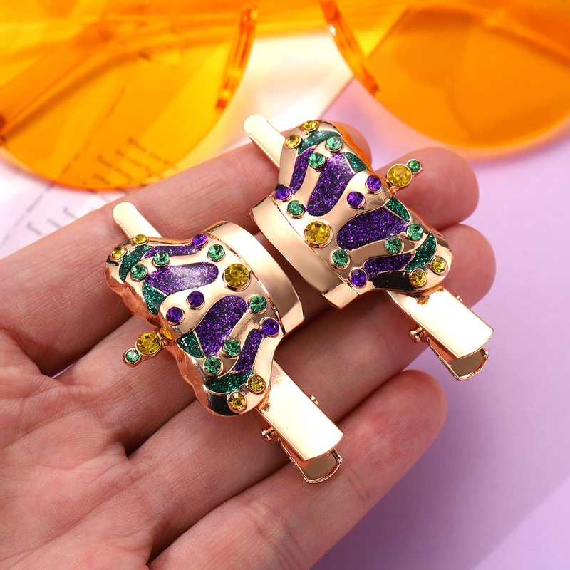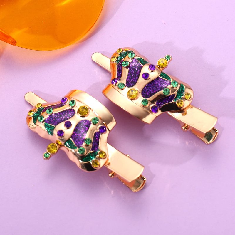 - Creative Mardi Gras Hair Clips -- Add some sparkle to your parade look with this Mardi Gras Mask Crown Fleur De Lis charm hair clips! Features purple sparkly rhinestone glitter mask /Fleur De Lis charm attached to high-quality gold-tone metal alligator clips. add a pop of purple (and cuteness) through hair accessories and have fun.