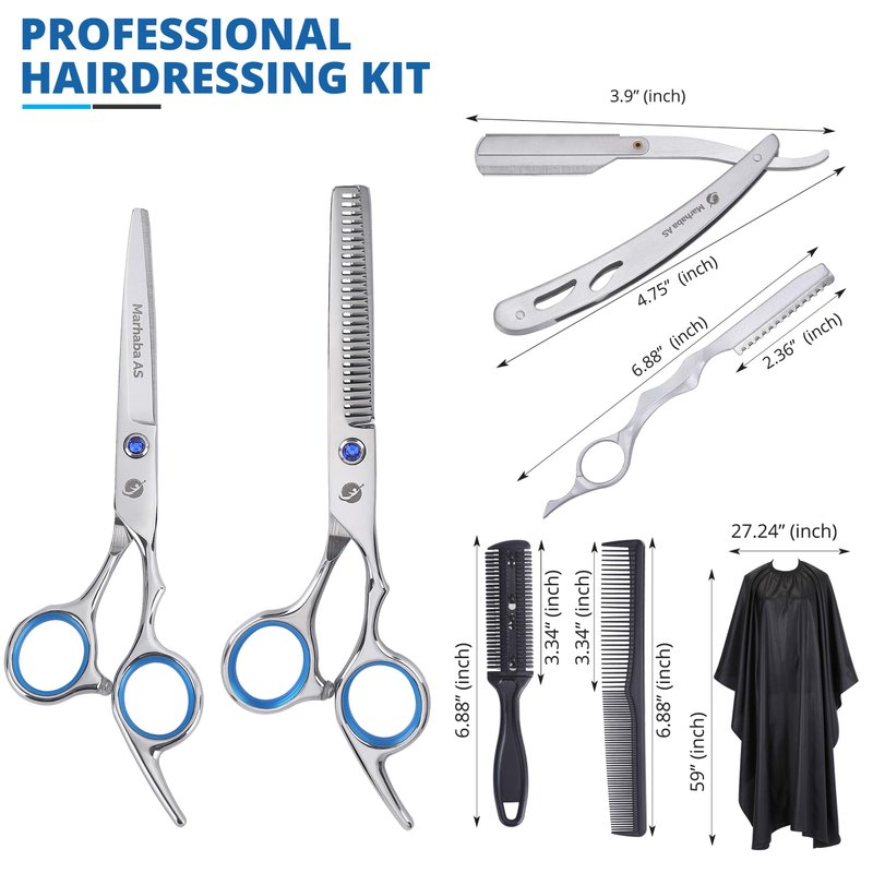 Marhaba AS Hair Cutting Scissors Kit - Professional 10 Piece Barber Scissors Set with Hair Scissors Thinning Shears for Hair Cutting, Stainless Steel Barber Scissors with Cape and Feather Razor