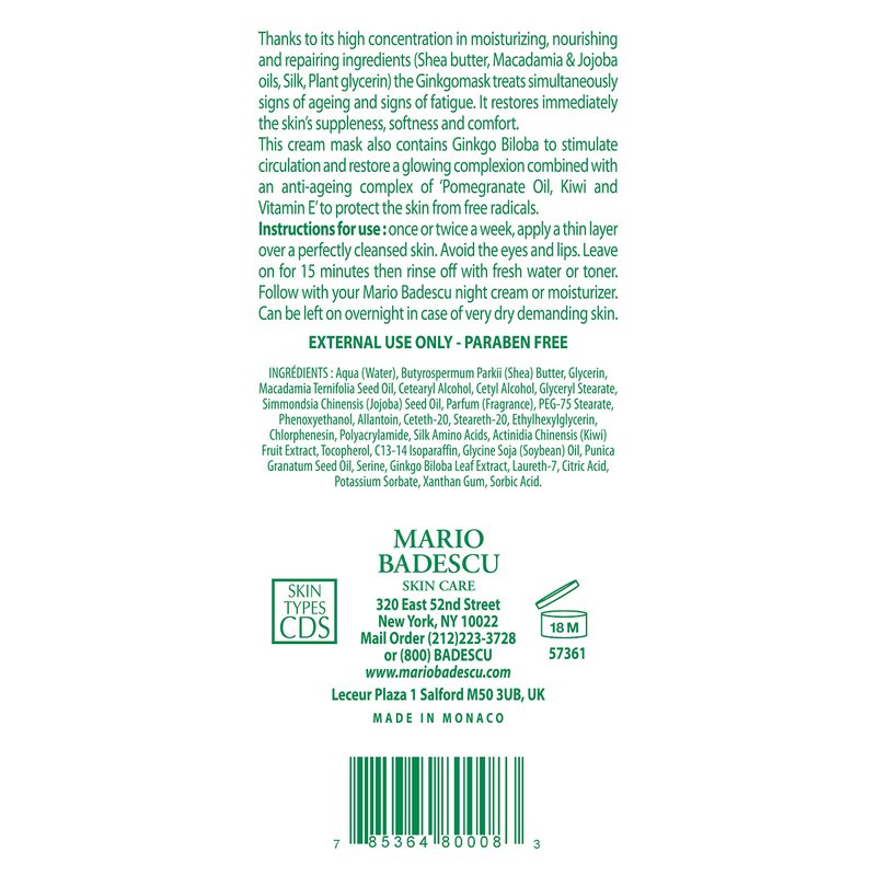 Mario Badescu Ginkgo Mask, Hydrating Skin Care Face Mask for Men and Women with Shea Butter and Vitamin E, Nourishing Facial Mask for Softer, Smoother, Radiant Complexion, 2.5 Oz