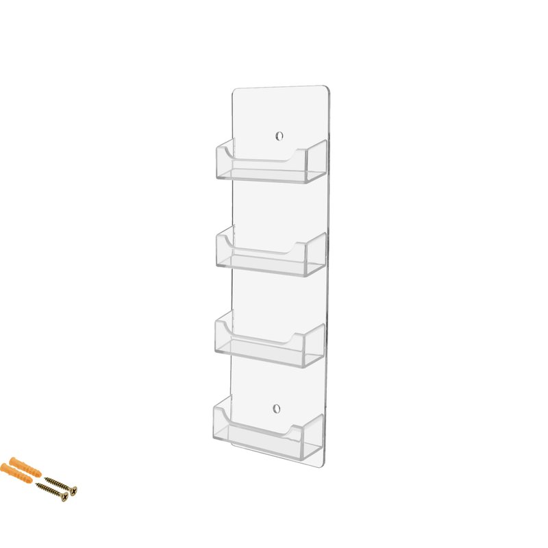 4 Pocket Gift Business Card Display Wall Rack Retail Office Product Features: Holds 3.5”W x 2”H standard sized business cards, appointment, membership, gift or rewards cards. Pocket Dimensions: 3.5”W x 2"H x 1”D. Overall Dimensions: 4.25"W x 10.5"H x 1"D. Pocket Capacity: 50 standard business cards or 30 gift cards. Perfect space saving multi pocket wall mount display holder with pre drilled holes and hanging hardware. This extra capacity 4 pocket space saving wall mount business card holder provides a sturdy display for business, gift or appointment cards that complements any decor. These multi slot card racks are great space savers and help you keep counters free and clear of clutter. Looking for a convenient way to distribute multiple sets of cards in one convenient card organizer rack? Business card holders make spreading the word on the multiple sets of cards simple and easy to access and still appear professional. Just one holder to display multiple sets of printed material and help keep the clutter to a minimum. The appointment card display rack has a design that makes it easy for clients and potential customers to take one. Each pocket can hold up to 50 standard business cards so you will not have to fill them that often. This gift card showcase display is made with acrylic plastic material and made right here in the USA. The wall card rack provides long-term durability in addition to keeping your 3.5 inch by 2 inch printed material neatly in the holder, and can be easily placed on any wall by exits or entrances. We have designed these to display several sets of business cards and can be conveniently placed on walls or anywhere you want to leave your calling cards for the taking. These card holders come pre-drilled for easy hanging and includes hardware. All sizes are approximate. Under no circumstances are we responsible for any actions involving hanging products using self purchased or provided hardware.