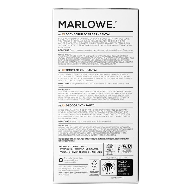 MARLOWE. Men's Body Care Essentials - Santal Body Set Experience luxury grooming made simple with the MARLOWE. Santal Body Set. This premium collection delivers a daily dose of energizing freshness, transforming your grooming routine into an invigorating ritual. Featuring our signature Santal scent, each product works effortlessly to cleanse, and nourish your skin and leave you smelling amazing. The Scrub Bar Soap gently exfoliates, removing dirt and rough patches without stripping moisture, while the deodorant neutralizes odor and wetness without aluminum or baking soda. Our moisturizing body lotion absorbs quickly, helping to deliver deep hydration without any greasy residue. All three feature our signature Santal fragrance – an elevated blend of warm sandalwood, rich amber, and bright citron that evolves beautifully throughout the day. MARLOWE. delivers powerful skincare and grooming without compromise. We formulate without harsh chemicals like phthalates, SLS/SLES, and parabens, giving you clean results you can trust. Made in the USA from premium global ingredients, our vegan, cruelty-free products prove that effective skincare doesn't need to be complicated