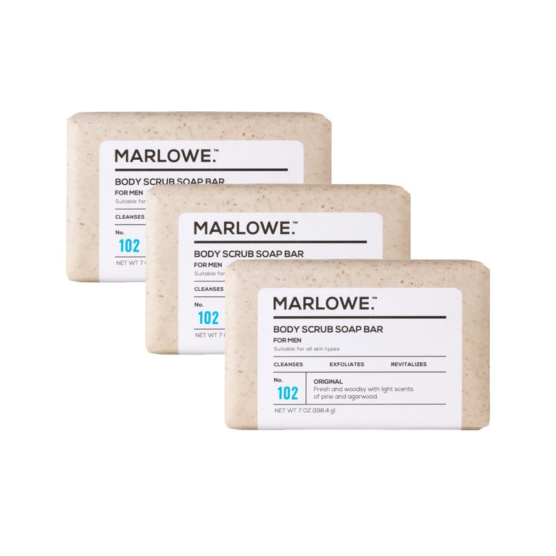 MARLOWE. No. 102 Men's Body Scrub Soap 7 oz (3 Bars) Fresh Original Woodsy Scent, Exfoliating Bar for Men with Natural Ingredients, Apricot Seed Powder, Shea Butter, Olive Oil, Green Tea Extracts