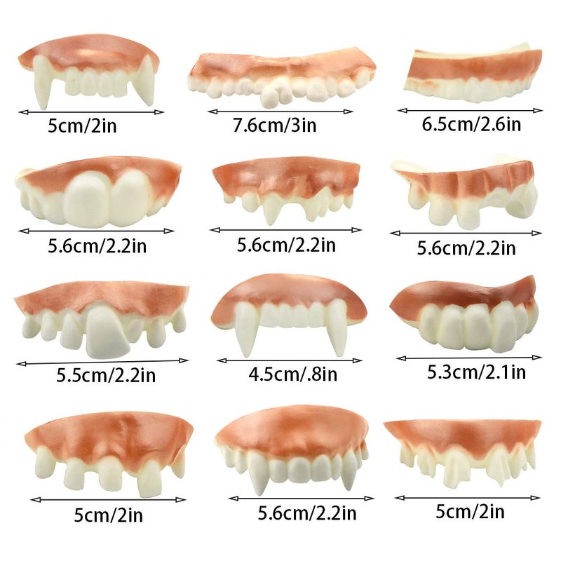 - Funny Teeth Set -- You will get 12 pieces gnarly teeth in 12 different styles, is about 1.8 to 3 in. long, each style is different in size and one size fits most. Ample quantity can meet most of your needs.