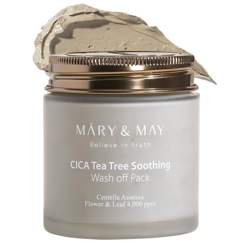 Mary&May Cica Tea Tree Soothing Wash Off Pack A wash-off pack that contains real Centella asiatica leaf and flower, which has excellent soothing effects, Houttuynia cordata extract + Tea tree extract to soothe irritated skin and care for sebum and wastes, 125g" Sensitive sedation (Cica tea tree soothing wash-off pack) - Soft cream type that can be easily washed off with wtaer without cleanser, leaving the skin moist and soft even after use without dryness or tightness. - No animal ingredients - Cruelty free - Ben on the use of genetically modified ingredients - All ingredients EWG Green grade