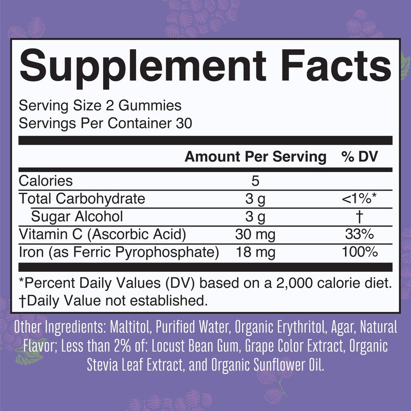 - Adult Iron Gummies: Receive 100% Recommended Daily Value of This Essential Mineral for Health! Enjoy each two-gummy serving of tasty grape-flavored vegan gummies.