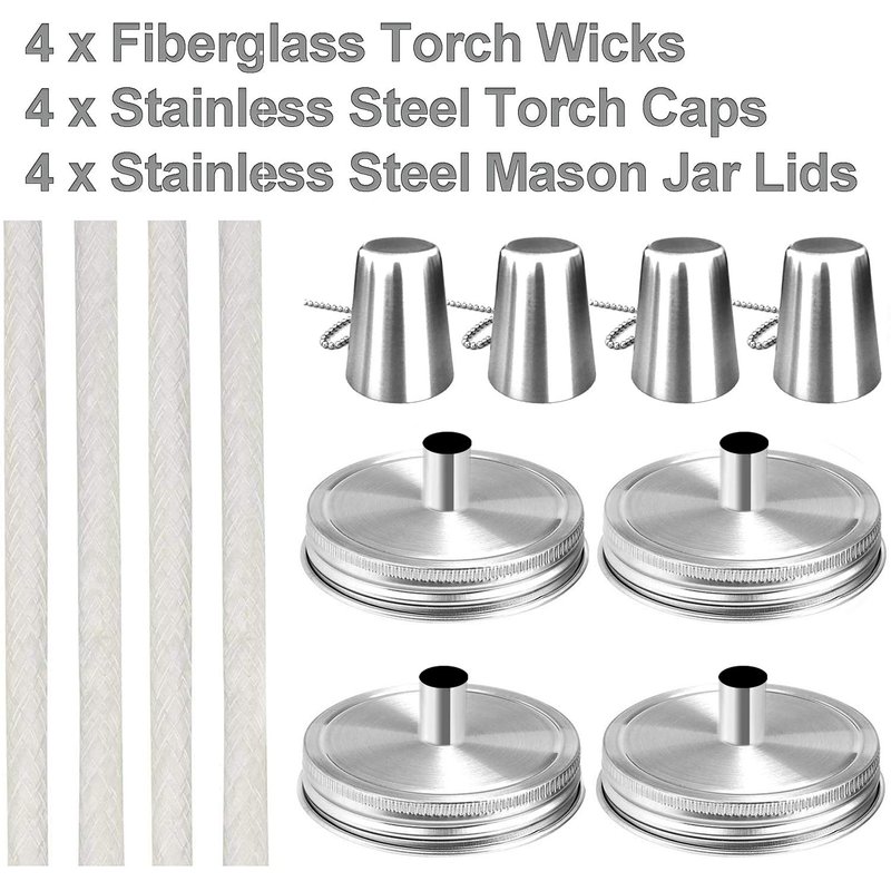Mason Jar Tabletop Torch Kits,4 Pack Longlife Fiberglass Wicks,Stainless Steel Mason Jar Lids Caps Included,Outdoor Deck Oil Lamp Torch