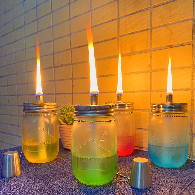 - Anti-rust&Burn Mark Resistent:Mason jar oil lights lids and caps are all black coating,The table torch wicks breathe a warm lights create a romantic atmosphere,perfect for garden lighting, bar,sea side,patio,table ,or outdoor lighting.