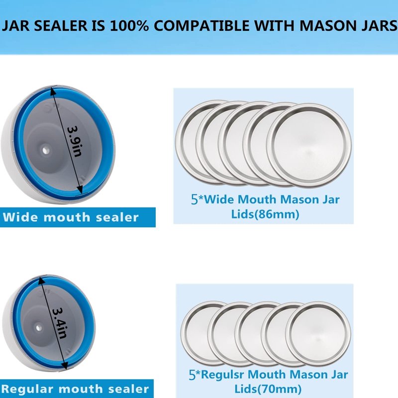 - 【Food Saver Jar Sealer Attachment】-5Pcs* Wide-mouth Jar Lids (86 mm) and 5Pcs* Regular-mouth Jar Lids (70 mm)More caps spare consumables, no extra money to buy, can't open in time Sealed mason jar lids? Don't worry, we have a dedicated lid opener that allows you to easily open Mason lids. The compact and delicate aluminum design makes it durable and easy to carry.Also can be a Mother's Day gift for mom, friends and family