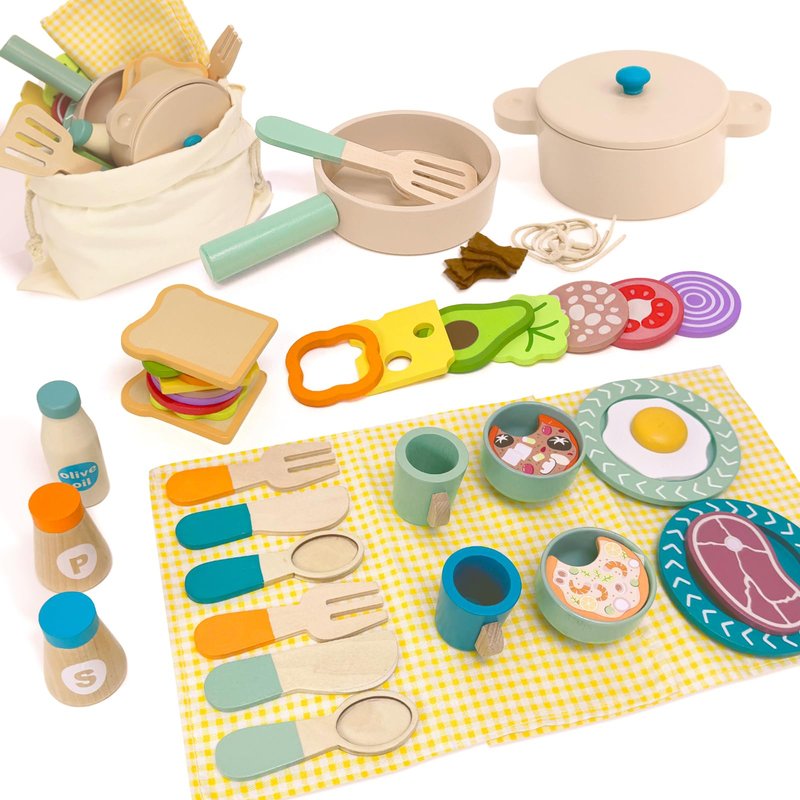 - RICH PLAY KITCHEN ACCESSORIES: This montessori cooking set for toddlers comes with 36 pieces of play kitchen food accessories, including toy pots and pans, cutlery, and a variety of wooden food toys. These simulated food toys allow kids to realistically simulate kitchen play. The rich kitchen playset accessories can also support multiple children to play together and share the fun together.