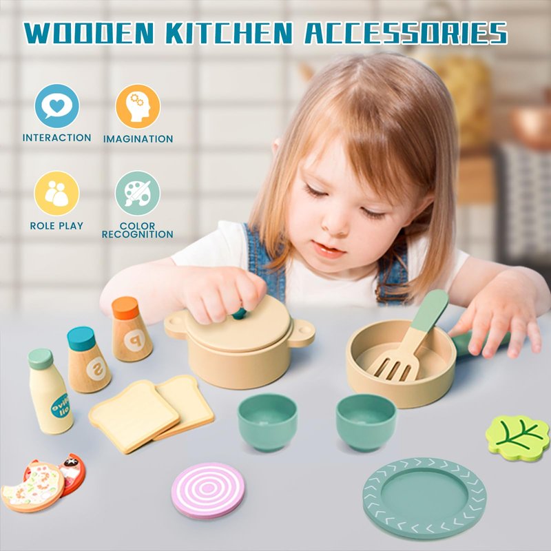 - SAFE KIDS PLAY KITCHEN TOYS -- This Wooden Play Cooking Set is made of natural wood and non-toxic water-based paint, with smooth edges and corners that won't hurt your child's little hands. This wooden kitchen toys can provide a safe and creative play experience.