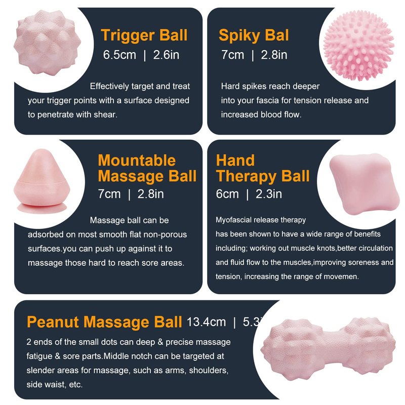 - 【COMPLETE MASSAGE BALL KIT 】: Our 5 in 1 massage ball set was specifically designed for people who are looking for deep tissue massage, myofascial & trigger point release. Our bundle pack includes 2 Spiky Balls Firm/Soft, Peanut Ball, a Mountable Self Ball, a Hand Roller Ball for Back, a carry bag and comprehensive exercise guide.