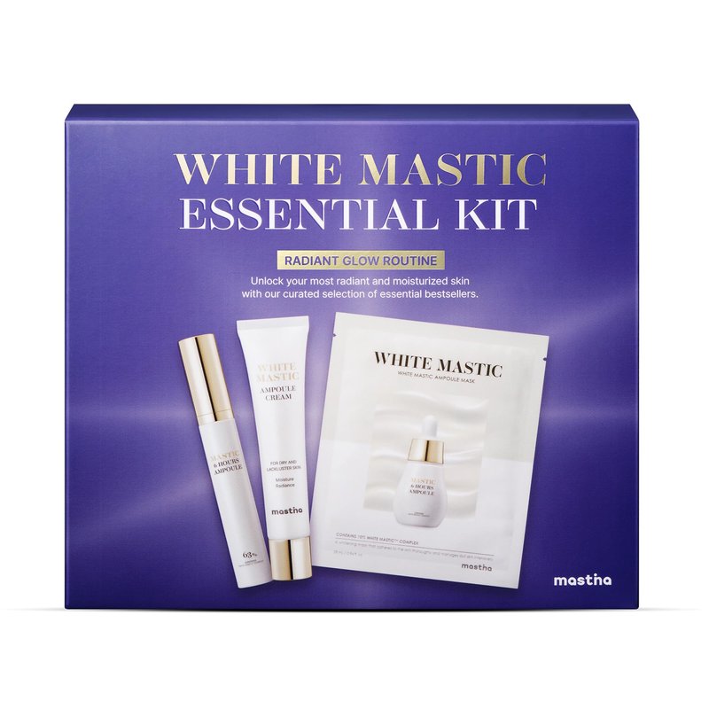 - MASTINA WHITE MASTIC ESSENTIAL KIT - Each set comes with White Mastic Ampoule Cream (40ml/1.35fl oz), White Mastic 6-Hours Ampoule Roller Stick (15g/0.5oz), and White Mastic Ampoule Mask (4 pcs).