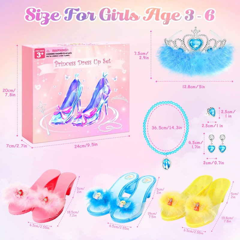 - Princess Dress Up Set - The girls dress up shoes length 7.5 in, shoes width 2.7 in, heel height 2 in, fit most girls aged 3-6 years old, match different colors crowns and dress up jewelry. Every girls love to dress up & pretend play a little princess and can not resist our princess dress up shoes set.