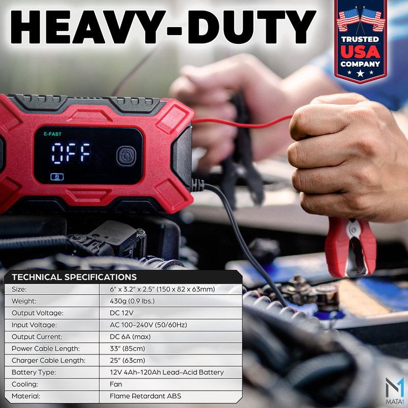 Say goodbye to sluggish starts and hello to unstoppable adventures!The Mata1 Smart Pulse Repair Battery Charger is specifically designed to revitalize your car's battery, infusing it with new life. With its versatile 4 charging modes, it delivers rapid and dependable charging, ensuring you stay on the move with confidence. Its compact design allows for easy storage and portability. Additionally, it boasts a range of advanced safety features, including flame-retardant ABS construction, short circuit protection, reverse polarity protection, and temperature compensation, all working together to provide maximum safety and peace of mind. Moreover, it comes with a smart LCD screen display that allows for effortless monitoring of the charging status and detailed information. Don't wait any longer, choose the Mata1 Smart Battery Charger and experience a fresh surge of energy in your automotive life. For all charging needs, make it Mata1!