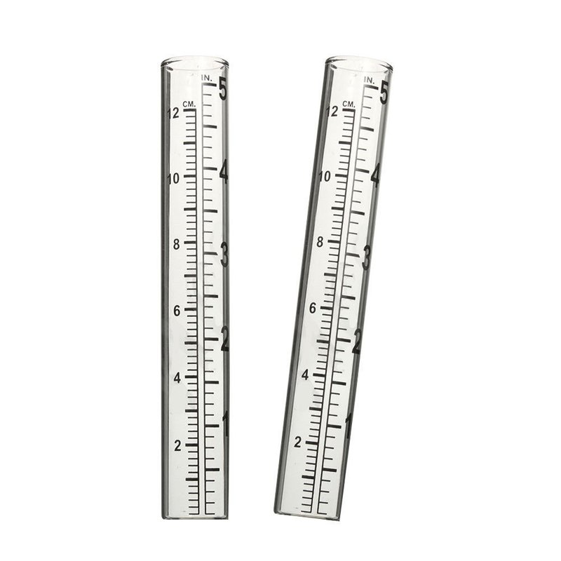 - Clear color, Crafted of durable glass. Package: 2 x 5" Rain Gauge Tubes