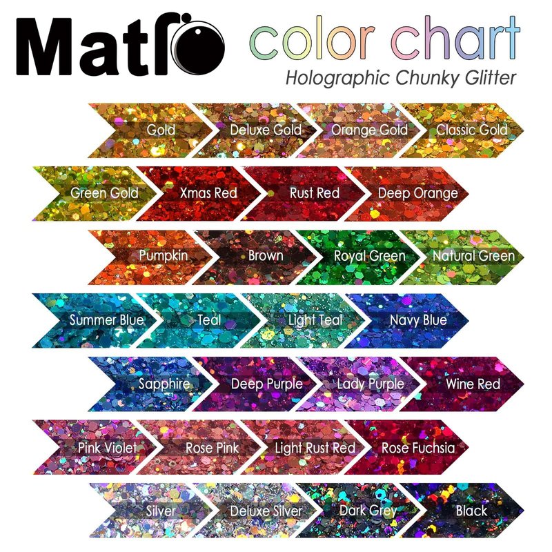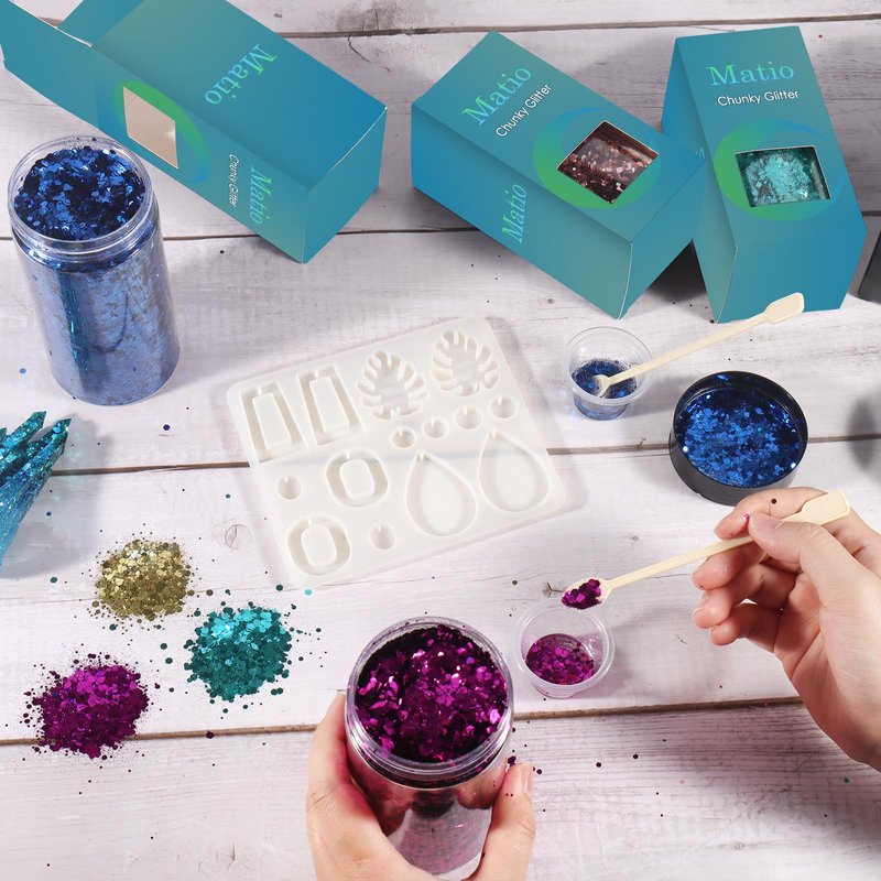 - 🖤【PREMIUM & HARD TO FADE】: Matio resin chunky glitter is made from quality safe PET material without toxicity. You can casually place glitter powders as you need. Also, the chunky glitters are durable for a very long time. Not easy to fade off.