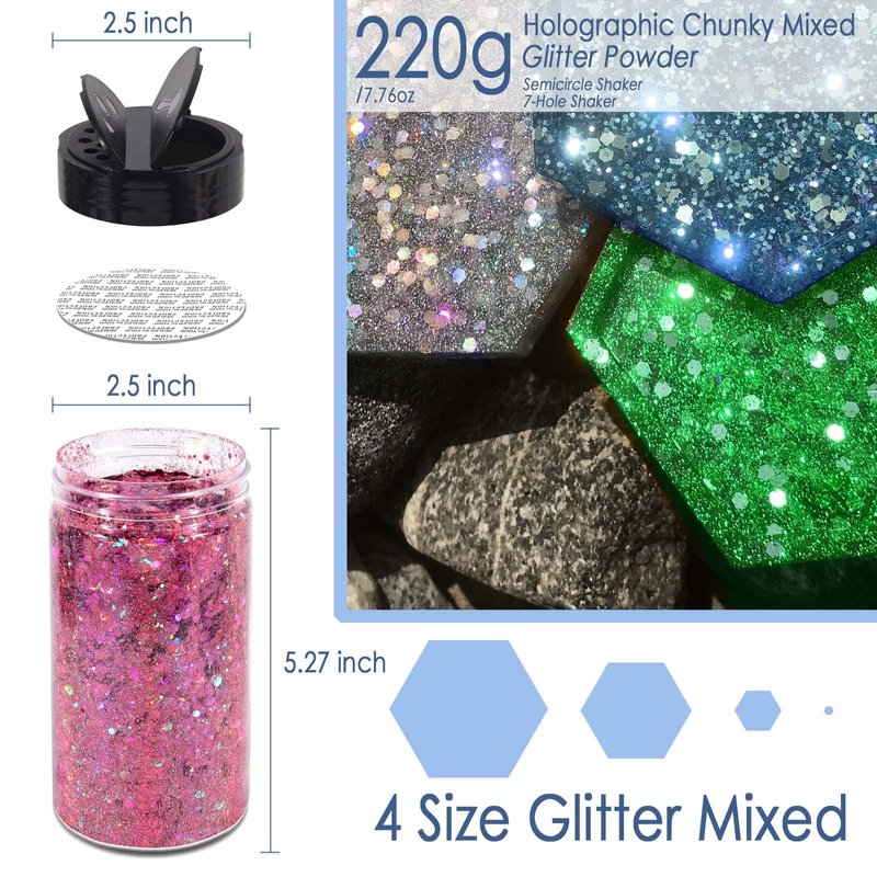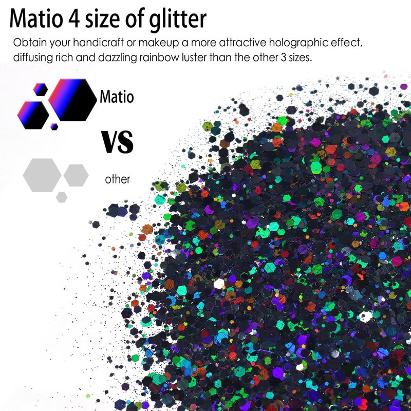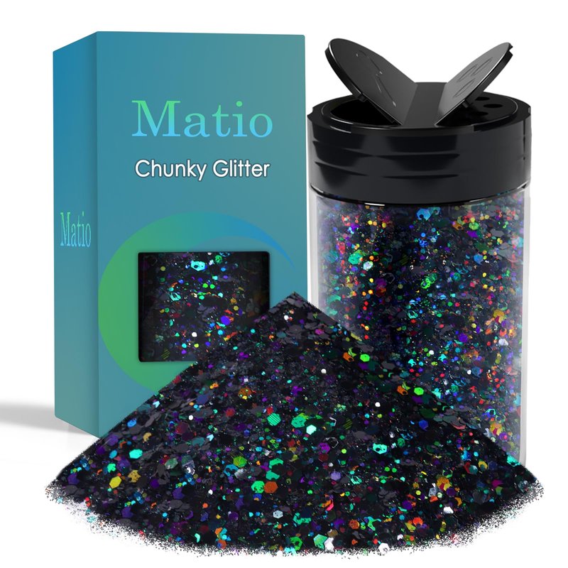 - 🖤【MORE COLORS & LARGE JAR】: Matio holographic black glitter mixed with ultra fine glitter powder comes with 28-color glitters of various types, and it's a large chunky glitter with 7.8oz/220g capacity for any-size arts and projects. The chunky glitter mixed with flakes is shining.