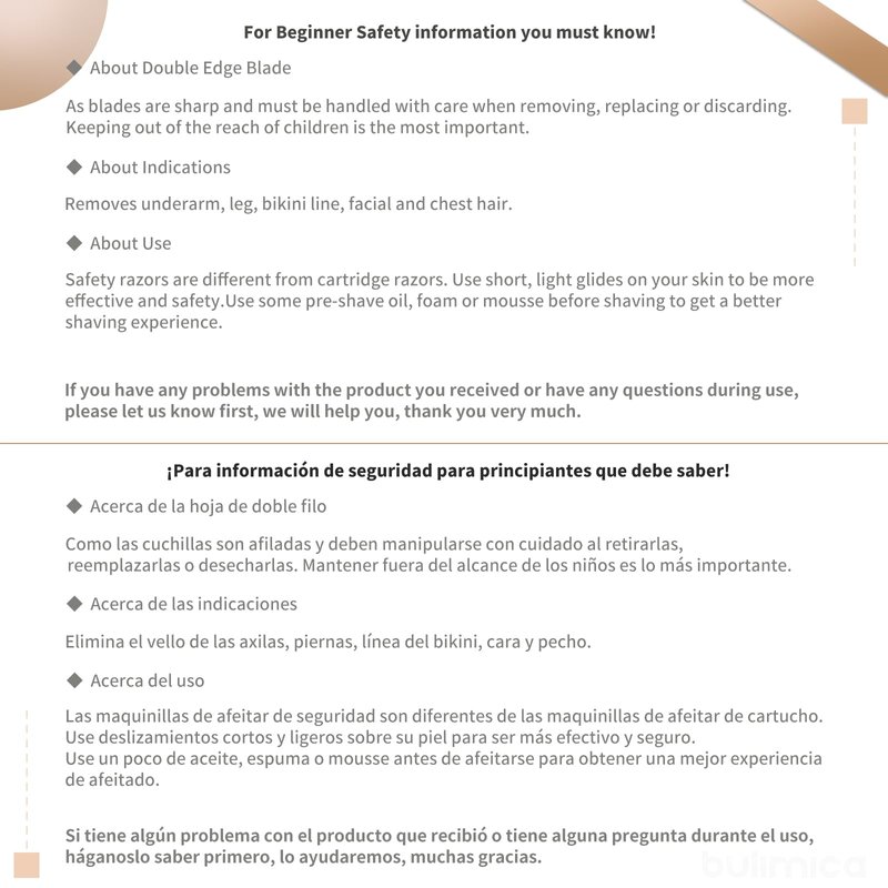BULIMICA safety razors are crafted with high-quality materials and designed to provide a top-notch shaving experience. Compared to traditional razors, our safety razor has a gentler blade angle, resulting in a more comfortable and less irritating shave. Additionally, our product features an anti-slip handle design that enhances stability and reduces the risk of accidental cuts. Our safety razor also with 10 platinum-coated blades that provide an even smoother and more precise shave. The use of platinum coating ensures a long-lasting and durable blade, making it a sustainable and cost-effective choice for our customers. We are proud to offer environmentally-friendly packaging, free of any plastic materials, to demonstrate our commitment to sustainability. The perfect gifts for Mother's Day, Father's Day, Christmas, Thanksgiving day.