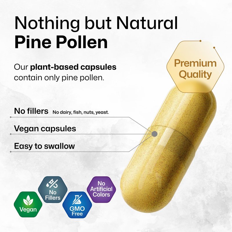 - Vegan and Pure - Our pine pollen tablets are organic and contain no fillers, offering a neutral taste and smell. Just 2 vegan capsules a day provide a powerful supply of pine pollen nutrients for immune support over a span of 50 days.