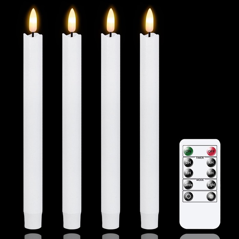 - LED TAPER CANDLES: You will receive 4 white flameless taper candles(0.78” x 9.64”), one remote control and one manual. Our flickering taper candles are made of the highest quality real wax and have been strictly tested before leaving the factory to ensure the flameless taper candles are durable and not easy cracked