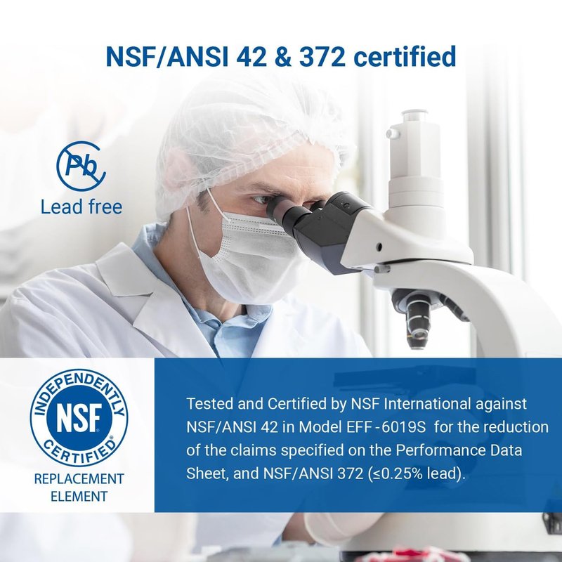 - Authoritative NSF certified: This filter is certified to reduce harmful substances such as 99.2% of bisphenol A, phenytoin, estrone and naproxen in accordance with 42 and 372 standards. It also complies with NSF/ANSI 53 standards for the reduction of 99.6% of lead, 96.6% of benzene, and 92.3% of mercury. Certified by IAPMO, it can reduce up to 20 harmful substances, including 99.59% of ethylbenzene, over 99% of trimethoprim, 2,4 D, Lindane, MTBE, and atrazine.