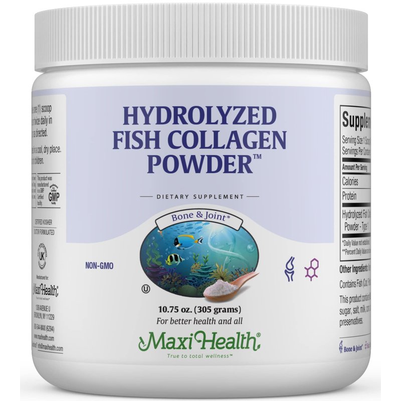 The biggest advantage of Marine Collagen is that it is the most bioavailable type of collagen. This means your body can absorb the collagen more 1.5x more efficiently than land-animal collagen sources, which have a higher risk of contamination through hormones. When collagen levels drop, it leads to negative effects on hair, skin, and bone health. Easy-to-take unflavored collagen powder is a great alternative to capsules or pills and can be mixed directly into food or drink. One serving contains 10g of hydrolyzed fish collagen protein powder (Type I) sourced from wild caught cod, pollock, and haddock. ALL 20 AMINO ACIDS PER SERVING: Alanine….850 mg Arginine….1060 mg Aspartic Acid….470 mg Glutamine….970 mg Glycine….2180 mg Histidine….230 mg Hydroxyleucine….140 mg Hydroxyproline….680 mg Isoleucine….120 mg Leucine….220 mg Lysine….450 mg Methionine….170 mg Phenylalanine….210 mg Proline….1050 mg Serine....600 mg Threonine….370 mg Tyrosine….50 mg Valine….170 mg TYPE I MARINE COLLAGEN Rich in Type I collagen, the most prevalent type of collagen in the body and the one most responsible for healthy skin, hair, and nails. It’s also a major component of tendons, organs, and bones. Pescatarian friendly and kosher. WHY MAXI? Recognized as one of the largest, most advanced lines of premium kosher vitamins, minerals and herbs, Maxi includes over 130 proprietary nutritional supplements in tablet, capsule, powder, chewable and liquid forms. We are committed to not only developing the best formulas, but also to investing in scientific harmony from one formula to the next. All products in the Maxi catalog are designed to work together with one another, taking the guesswork out of your health routine. * These statements have not been evaluated by the Food and Drug Administration. This product is not intended to diagnose, treat, cure, or prevent any disease.