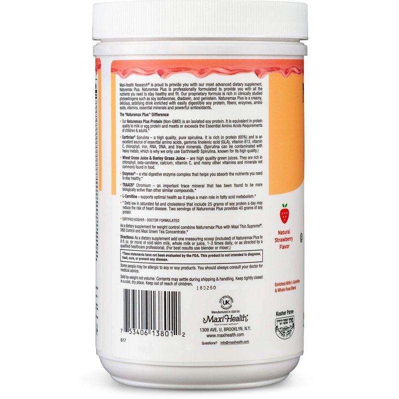 Maxi-Health NatureMAX PlusTM Energy Support Drink Soy Protein Powder - Sugar Free Diet Supplement - 20g Protein Per Serving - Natural Strawberry Flavor - Kosher Vitamin - 1lb