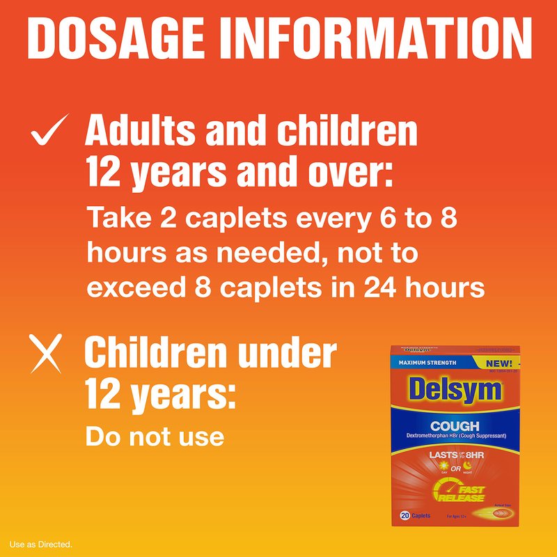 Maximum Strength Delsym Cough Suppressant, Fast Release Caplets, Lasts up to 8 Hour Day or Night, 20 Count (Packaging May Vary)