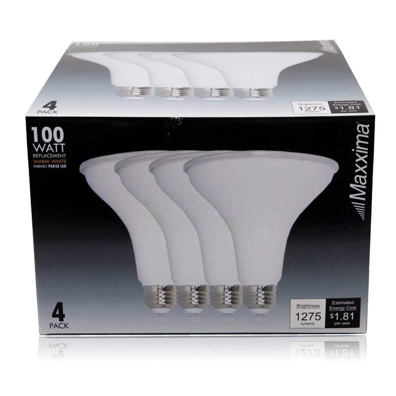 Maxxima PAR38 LED Indoor/Outdoor Light Bulbs - 3000K Warm White Light, 1275 Lumens, 15 Watts, 100 Watt Equivalent Dimmable Flood Light, 90 CRI, Energy Star, Wet-Rated for Outdoor Security Use - 4 Pack