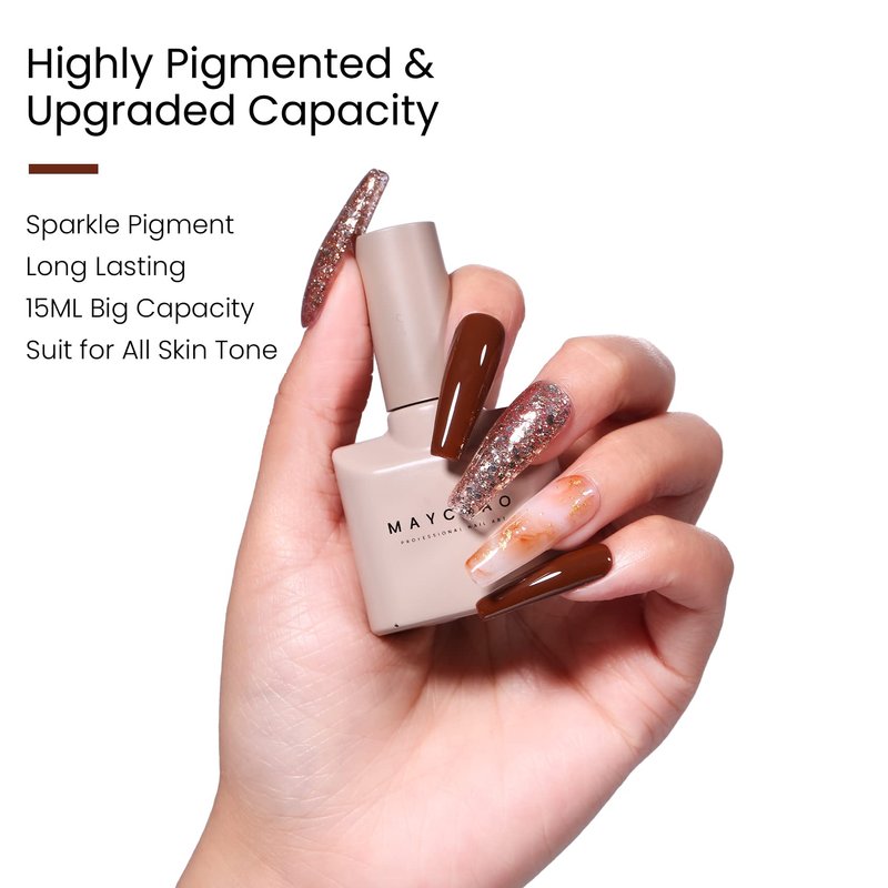 - Fast and Simple Nail Polish: MAYCHAO Gold Glitter Gel polish must be cured under an LED light. It is necessary to apply a base and top coat. Average LED light duration is 60-120 seconds. Simple application and tenacity.