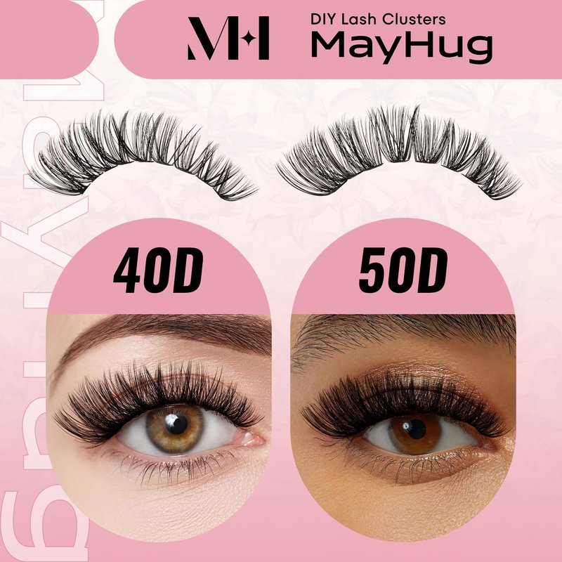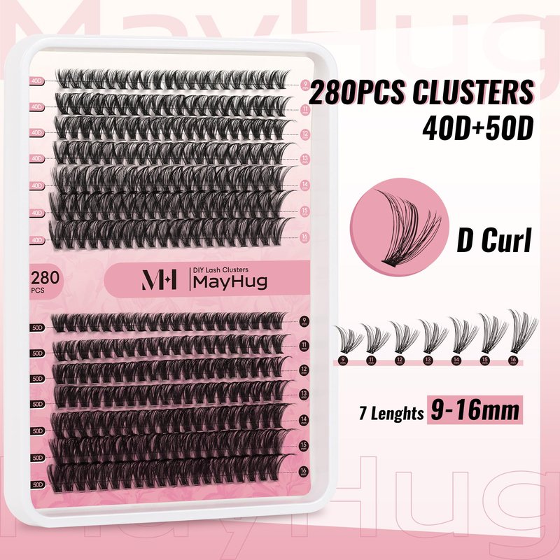 Mayhug Lash Clusters: D curl Style: Fluffy, Common, Natural, Cross, Classic Mixed Length: 9-16 mm Large Quantity: 280 pcs a tray High-Quality Lashes: These eyelash clusters extensions are made from professional artificial mink eyelashes, created by heat-bonding lash clusters for a fluffy effect. Each individual lashes is carefully handcrafted and adjusted for optimal lash results. DIY Eyelash Extensions at Home Just 3 minutes with Mayhug Cluster Lashes. Whether you're new to applying lashes or a seasoned pro, Mayhug makes the process quick and hassle-free, catering to all your daily lash needs. Soft and light, Easy to use. Suitable for most people and match daily or gorgeous makeup. You can according to your own needs, create your own favorite eyelash style by yourself, and simple operation, saving time and money. An exquisite and lovely pack is also a good choice to send your friends as a gift.