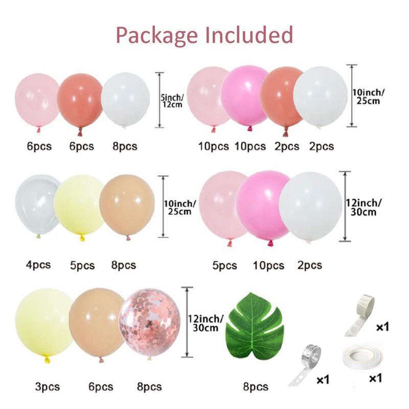 - [Tropical Balloon Arch]: This tropical-themed pink and yellow balloon garland includes: 12 white balloons, 8 orange balloons, 20 pink balloons, 21 soft pink balloons, 14 vintage yellow balloons, 8 light yellow balloons, 4 transparent balloons, 8 gold confetti balloons, 8 artificial leaves, 1 roll of decorative strip, 1 roll of balloon chain, 1 roll of balloon glue