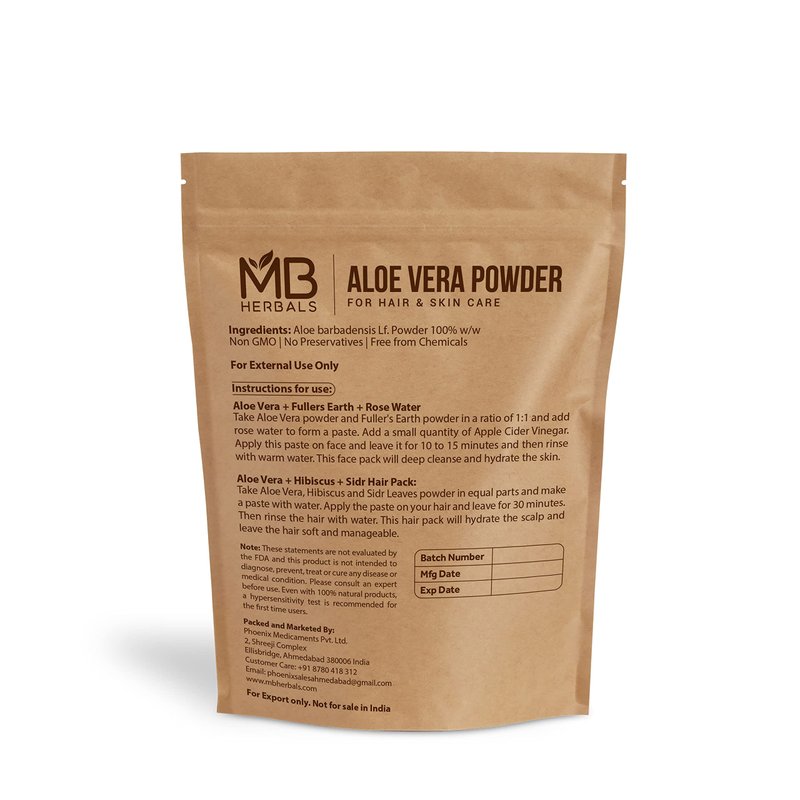 As a Hair Pack, MB Herbals Aloe Vera Powder can be added with Henna, Bhringaraj, Amla, Brahmi, Jatamansi and Hibiscus Powder and applied on hair.