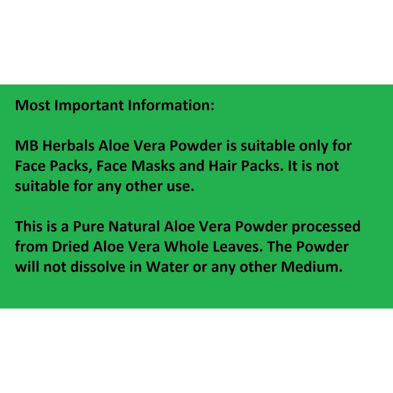 - FOR EXTERNAL USE ONLY | 100% Pure Aloe Vera Leaf Powder | Since this is a Whole Leaf Powder, where the outer rind is also crushed, it MUST NOT BE CONSUMED. The Green Part (Rind) of Aloe Vera Leaf contains Aloin, a kind of Natural Latex. Hence, THIS IS FOR EXTERNAL USE ONLY. | MB Herbals Aloe Vera Powder is suitable for Skin Care and Hair Care only.