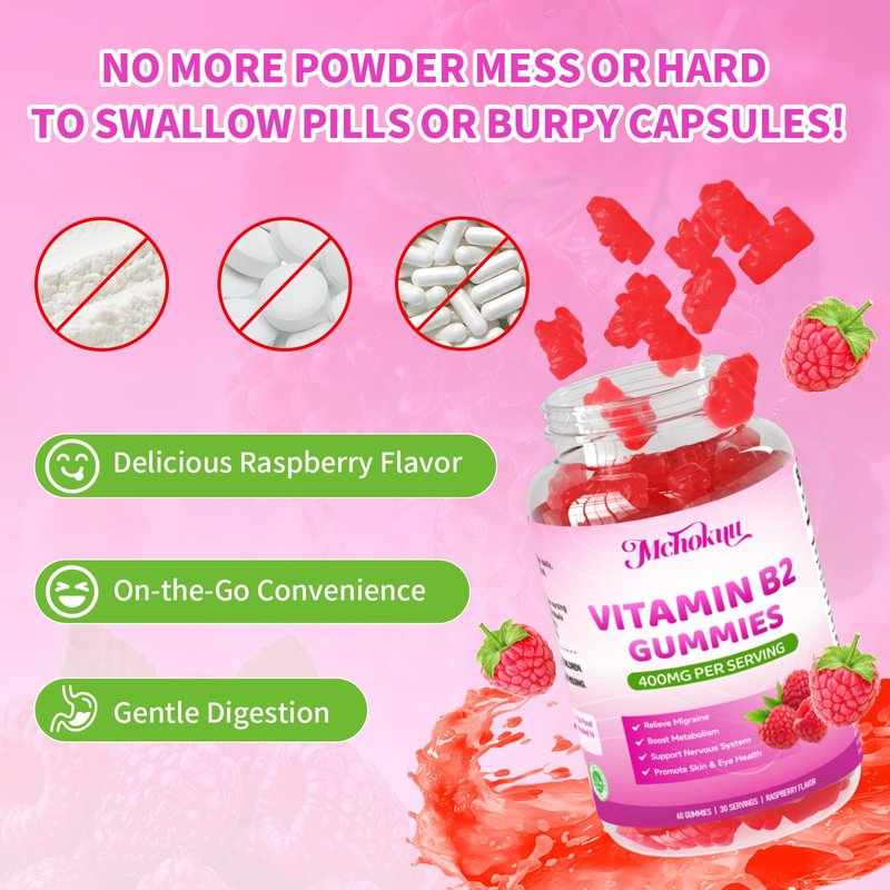 Mchokuu vitamin B2 gummies riboflavin 400mg provide essential support for better mitochondrial function, addressing the root cause to help you achieve natural migraine relief and sustained energy.