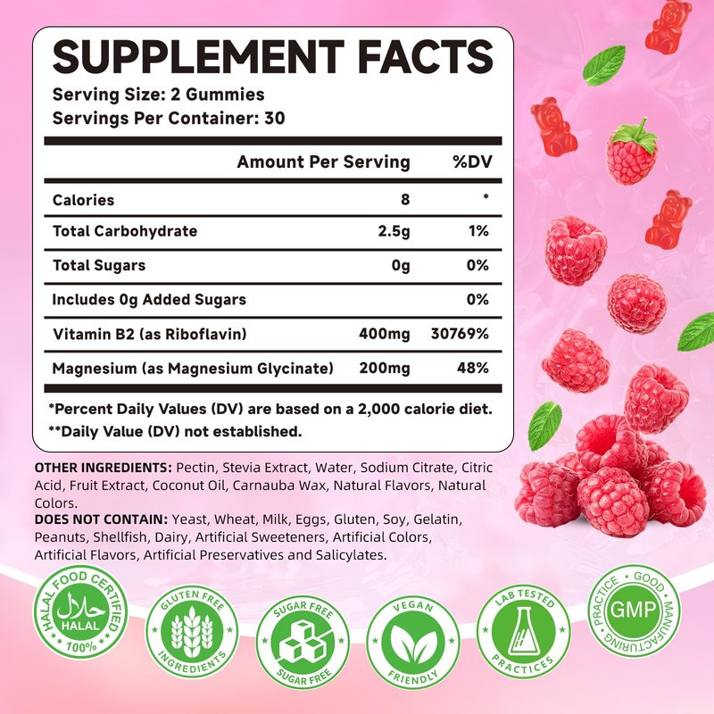 - Family-Friendly & Delicious: Sugar-free vitamin B2 riboflavin 400mg gummies are Delicious Raspberry Flavor, making it easy and fun for the whole family to take their vitamins every day. Each bottle gives you enough for 30 days (60 gummies, 2 per day)