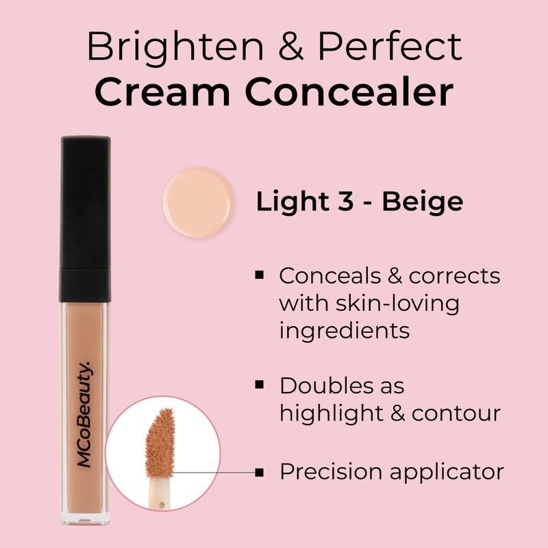 MCoBeauty Brighten & Perfect Cream Concealer, 3 Light Beige, Brightening Coverage for Flawless Complexion, Vegan, Cruelty Free Cosmetics