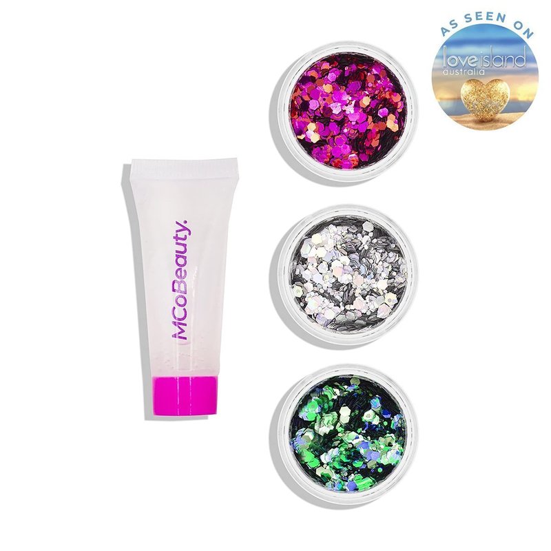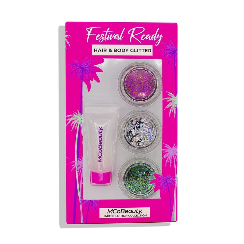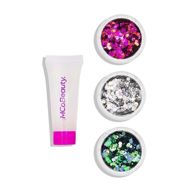 MCoBeauty Festival Ready Hair And Body Glitter Set - Effortless Glitter Enhances Beauty Look - Three Glitter Pots And A Gentle Adhesive Gloss - Creates The Perfect Base For Glitter Application - 4 Pc