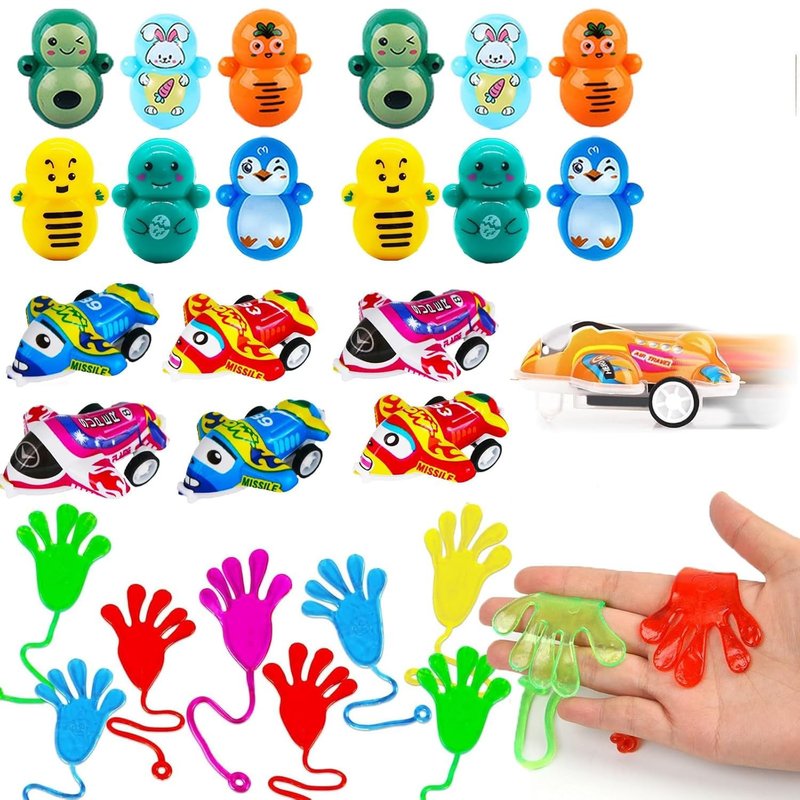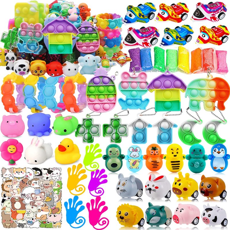 The 110 pieces kids' party favor sets contains a rich variety of small toys that allow children to interact and play at parties, including: 3 cute pop toys keychains, 3 pop bracelets, 6 mini pop keychains, 6 mochi squishies, 6 sticky hands, 6 animal pull Back cars, 6 Tumbler, 6 Pull Back Planes, 6 Cartoon Keychain, 8 fluffy toys, 60 Stickers.