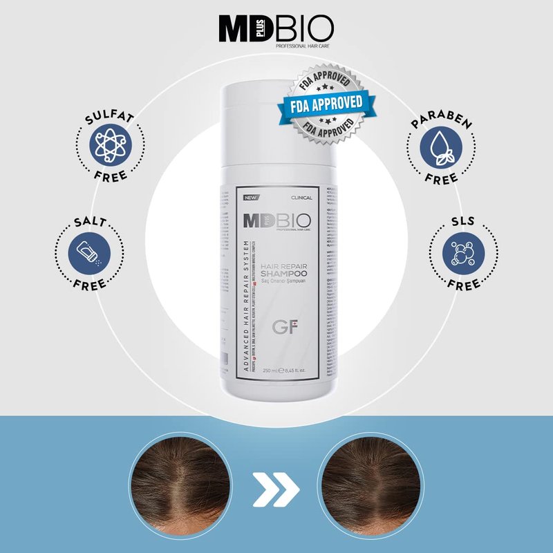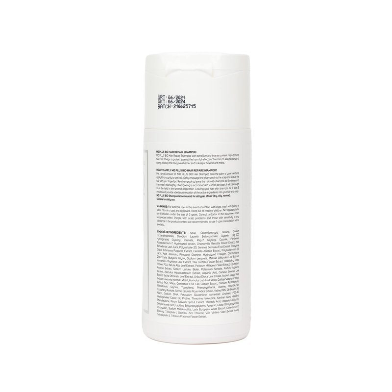 - MD Plus Bio Hair Repair Shampoo with intense content prevents hair loss and repairs the damaged structure of the hair. This product also eliminates crust and dandruff problems in regular use
