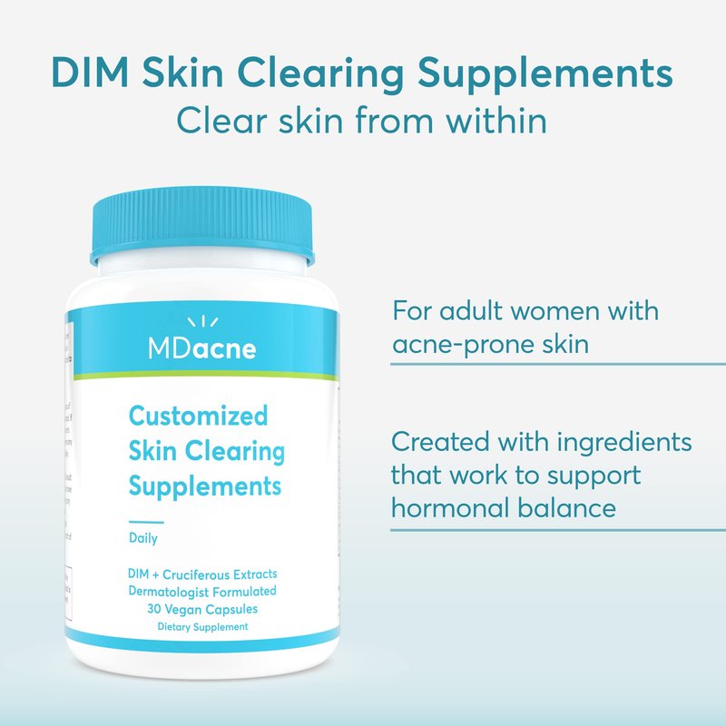 - MDacne DIM SKIN CLEARING SUPPLEMENTS: They say beauty comes from within. And hey, so does great skin, which is why we've created this groundbreaking DIM supplement. Specially formulated for women with adult hormonal acne, our DIM supplements work from the inside out to support your topical acne treatment. 30-day supply (30 capsules).