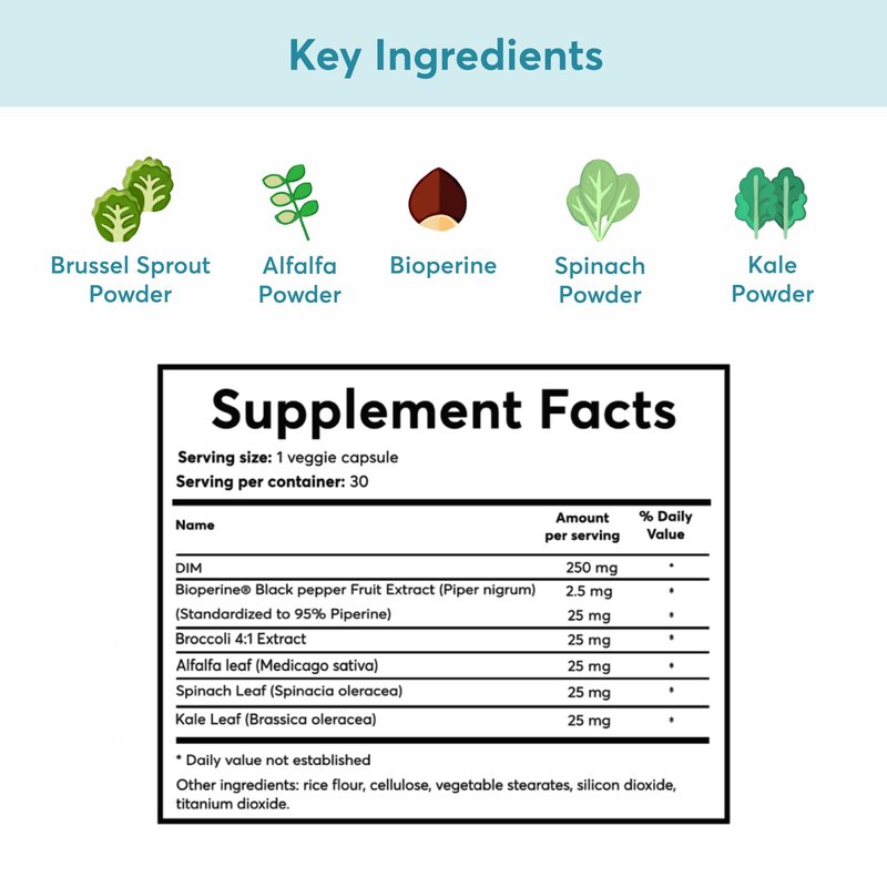 - OTHER KEY INGREDIENTS: Spinach Powder is believed to reduce excess sebum secretion while Kale Powder is known to help improve clogged pores and assist in skin cell regeneration. Alfalfa Powder is rich in antioxidants and Brussel Sprout Powder is believed to support the immune system. Bioperine is a black pepper extract that allows the body to absorb DIM and other nutrients better.